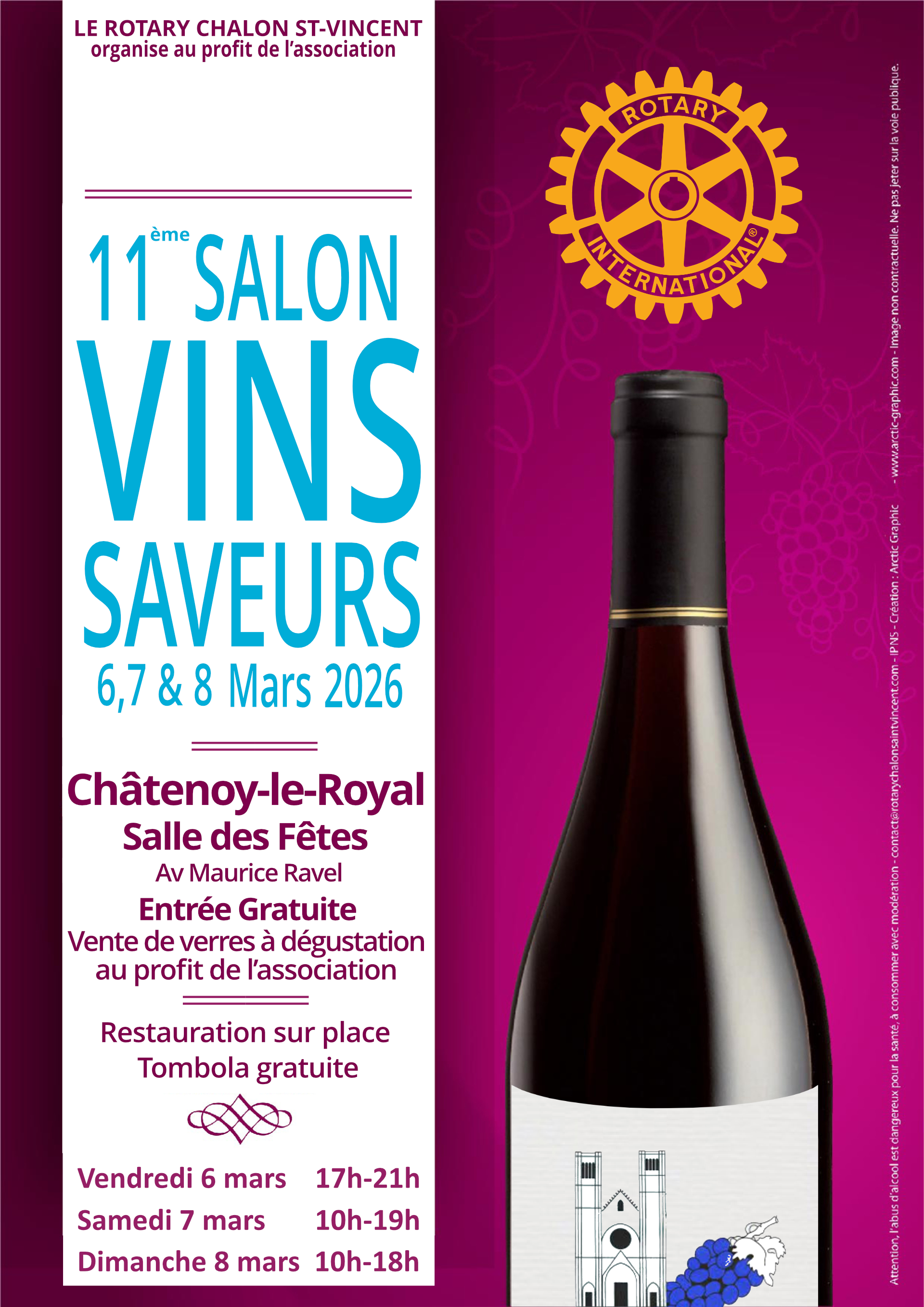 Nous serons présents au Salon Vins et Saveurs les 6 mars de 17h à 21 h, les 7 et 8 mars 2026, à partir de 10 h à Châtenoy Le Royal.